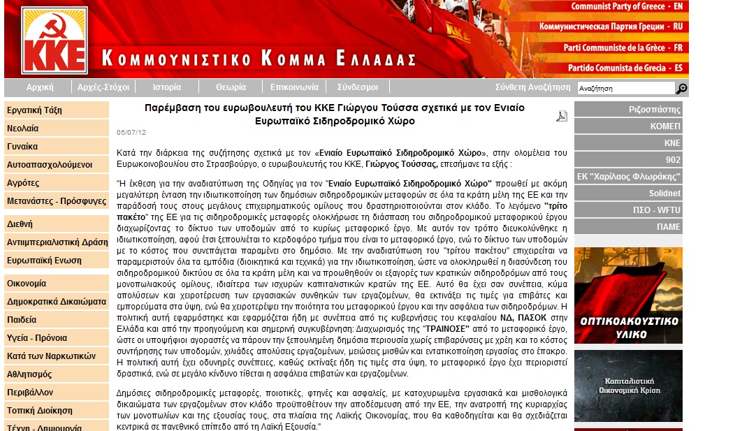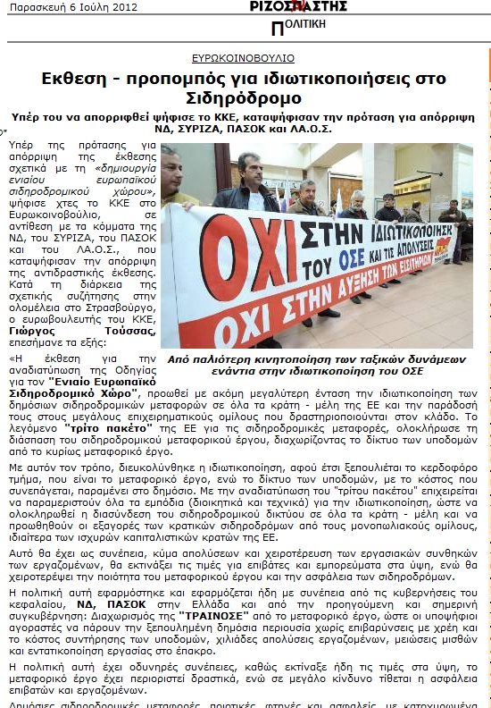 Δίνω στη δημοσιότητα από τα πρακτικά του Ευρωπαϊκού Κοινοβουλίου την «επεξήγηση ψήφου» που κατέθεσα στην έκθεση για τον «Ενιαίο Ευρωπαϊκό Σιδηροδρομικό Χώρο», όπου νομίζω ότι φαίνεται η κατηγορηματική μου αντίθεση στην ιδιωτικοποίηση των σιδηροδρόμων. Δίνω επίσης στη δημοσιότητα το link του Ριζοσπάστη με την συκοφαντία σε βάρος του ΣΥΡΙΖΑ και το link του ΚΚΕ από το οποίο ως «μαγική εικόνα» αφαιρέθηκε η επίμαχη φράση, χωρίς καμία εξήγηση.Θέλω να πιστεύω ότι αύριο ο Ριζοσπάστης θα φιλοξενήσει τη διαμαρτυρία μου και ότι θα αναγνωρίσει ότι έγινε κάποιο «λάθος». Θα ήταν μια καλή αρχή…» Ακολουθεί η επεξήγηση ψήφου του Ν.Χουντή:«Ψήφισα κατά στην έκθεση καθώς διαφωνώ πλήρως με την επιχειρούμενη προσπάθεια του Ευρωπαϊκού Συμβουλίου και όλων των πολιτικών ομάδων στο ΕΚ, με εξαίρεση την GUE/NGL, για την ιδιωτικοποίηση των ευρωπαϊκών σιδηροδρόμων. Διαφωνώ κατηγορηματικά με παραμέτρους που δημιουργούν το πλαίσιο για απολύσεις εργαζομένων, για ανάληψη της ευθύνης των ζητημάτων ασφάλειας και συντήρησης των σιδηροδρόμων από ιδιωτικές εταιρείες,Η διαδικασία των ιδιωτικοποιήσεων και μάλιστα σε κοινή ευρωπαϊκή κατεύθυνση θα στερήσει από τα κράτη μέλη τη δυνατότητα εξορθολογισμού, εκσυγχρονισμού και αναβάθμισης των δημοσίων σιδηροδρομικών δικτύων έτσι ώστε να βελτιωθούν οι παρεχόμενες υπηρεσίες στους πολίτες και να αυξηθούν τα δημόσια έσοδα. Η πλήρης απελευθέρωση των σιδηροδρόμων και μάλιστα υπό την έμμεση καθοδήγηση των ευρωπαϊκών οργάνων δεν εξασφαλίζει με κανένα τρόπο την αναβάθμιση τους. Αντίθετα μέσω του ανταγωνισμού των ιδιωτικών επιχειρήσεων θα αυξηθούν ακόμη περισσότερο οι κίνδυνοι για να καταβάλει η ιδία η κοινωνία τελικά το κόστος από ενδεχόμενες δυσλειτουργίες».