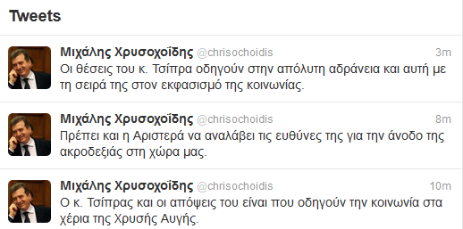 Ο υπουργός Προστασίας του Πολίτη, Μιχάλης Χρυσοχοίδης, απαντάει μέσω του twitter στον πρόεδρο του ΣΥΡΙΖΑ, Αλέξη Τσίπρα, ο οποίος τον χαρακτήρισε “πολιτικό απατεώνα” σε πρωινή εκπομπή. “Ο κ.Τσίπρας και οι απόψεις του είναι που οδηγούν την κοινωνία στα χέρια της Χρυσής Αυγής” γράφει ο υπουργός, ενώ στη συνέχεια καλεί την Αριστερά να αναλάβει τις ευθύνες της “για την άνοδο της ακροδεξιάς στη χώρα μας”.Δείτε τα tweets: