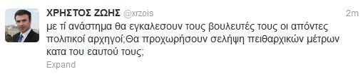Αυστηρή κριτική στους απόντες, κατά τη σημερινή ψηφοφορία στη Βουλή, πολιτικούς αρχηγούς, ασκεί ο Χρήστος Ζώης, ο οποίος διερωτάται ”με τί ανάστημα θα εγκαλέσουν τους βουλευτές τους”.