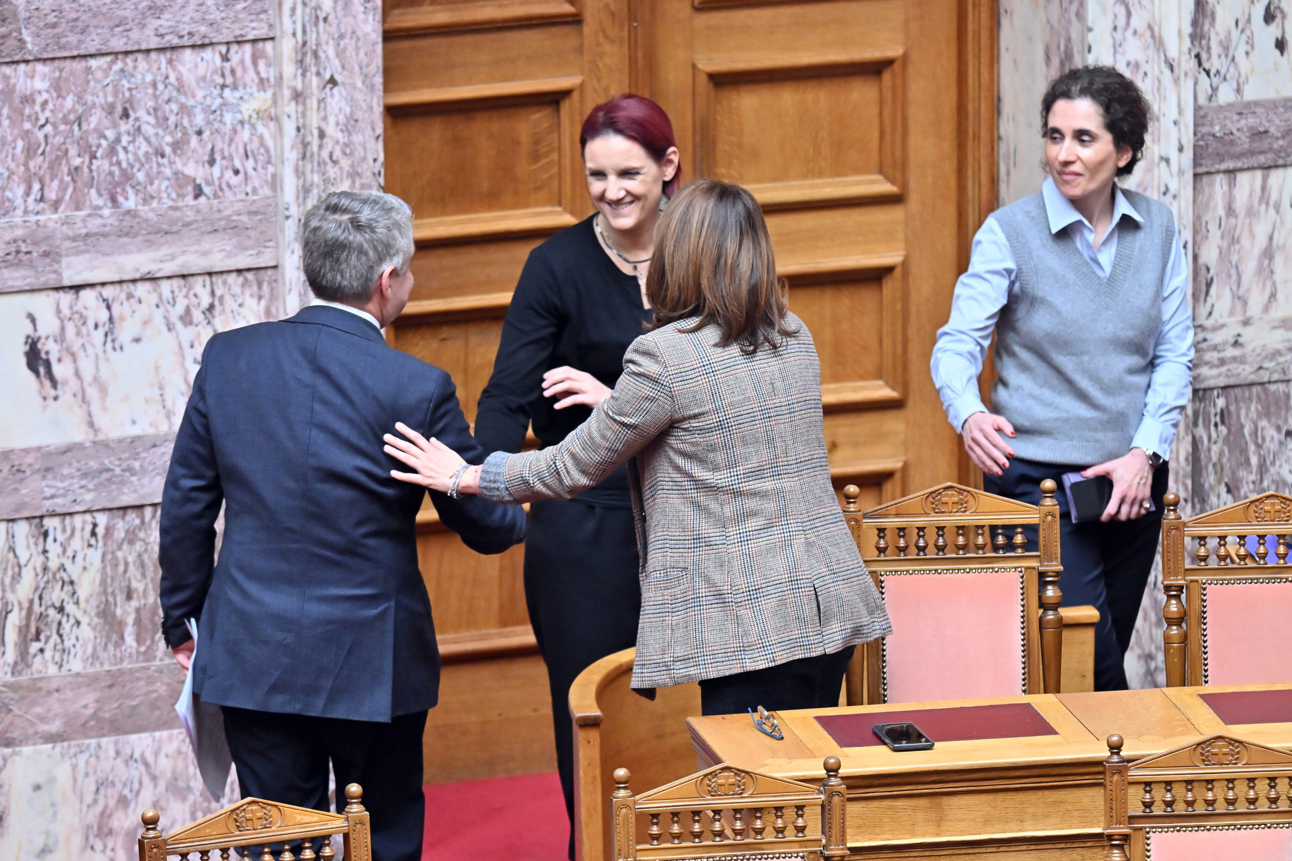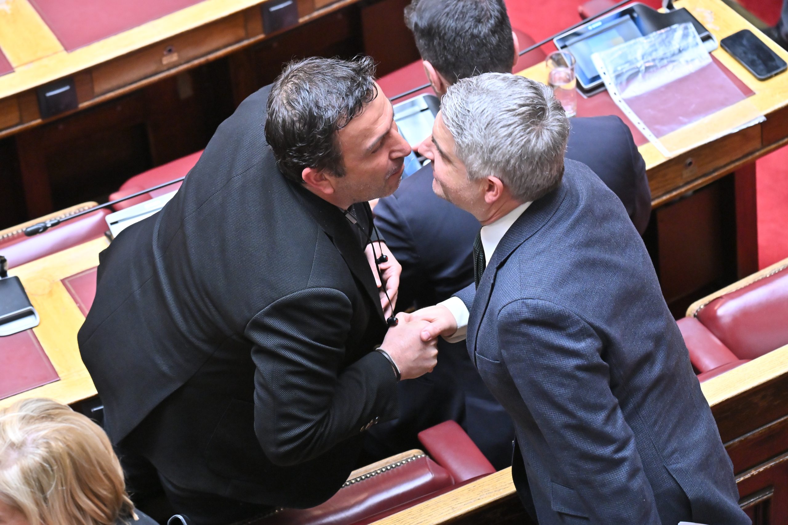 Αμέσως μόλις κατέβηκε από το βήμα, οι βουλευτές που ήταν παρόντες στην αίθουσα έσπευσαν να αποχαιρετήσουν τον Οδυσσέα Κωνσταντινόπουλο, ο οποίος παραδίδει την έδρα του μετά τη διαγραφή του από την Κοινοβουλευτική Ομάδα του ΠΑΣΟΚ.