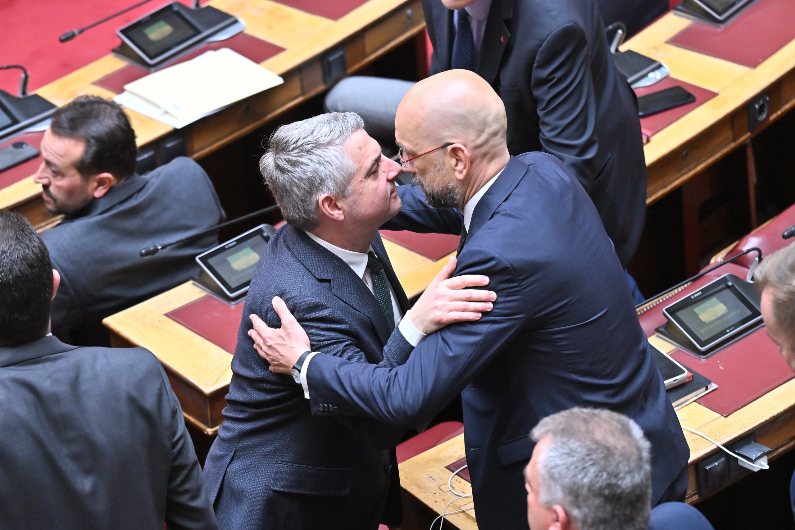 Συνάδελφοί του από το ΠΑΣΟΚ αλλά και από άλλα κόμματα έσπευσαν να τον ασπαστούν, υπουργοί της ΝΔ σηκώθηκαν από τα έδρανά τους για να τον αποχαιρετήσουν, ενώ χειραψία είχε και με τον πρόεδρο της Νίκης, Δημήτρη Νατσιό.