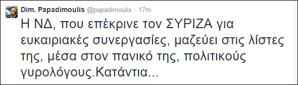 «Η ΝΔ, που επέκρινε τον ΣΥΡΙΖΑ για ευκαιριακές συνεργασίες, μαζεύει στις λίστες της, μέσα στον πανικό της, πολιτικούς γυρολόγους. Κατάντια…», έγραψε ο κ. Παπαδημούλης.