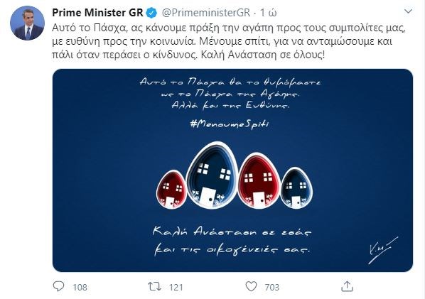 “Αυτό το Πάσχα, ας κάνουμε πράξη την αγάπη προς τους συμπολίτες μας, με ευθύνη προς την κοινωνία. Μένουμε σπίτι, για να ανταμώσουμε και πάλι όταν περάσει ο κίνδυνος. Καλή Ανάσταση σε όλους!”, έγραψε ο κ. Μητσοτάκης στον λογαριασμό του στο Twitter.