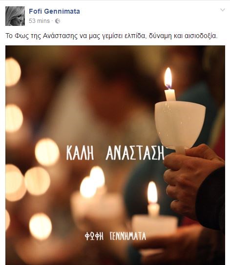 Mε ανάρτησή της στο Facebook η επικεφαλής της Δημοκρατικής Συμπαράταξης και πρόεδρος του ΠΑΣΟΚ Φώφη Γεννηματά στέλνει τις ευχές της για το Πάσχα.