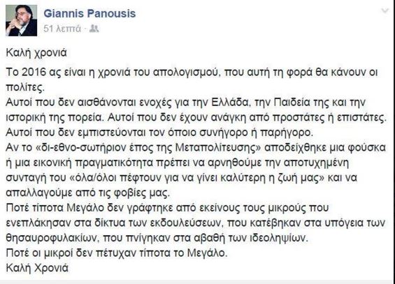 «Καλή χρονιά. Το 2016 ας είναι η χρονιά του απολογισμού, που αυτή τη φορά θα κάνουν οι πολίτες. Αυτοί που δεν αισθάνονται ενοχές για την Ελλάδα, την Παιδεία της και την ιστορική της πορεία. Αυτοί που δεν έχουν ανάγκη από προστάτες ή επιστάτες. Αυτοί που δεν εμπιστεύονται τον όποιο συνήγορο ή παρήγορο. Αν το «δι-εθνο-σωτήριον έπος της Μεταπολίτευσης» αποδείχθηκε μια φούσκα ή μια εικονική πραγματικότητα πρέπει να αρνηθούμε την αποτυχημένη συνταγή του «όλα/όλοι πέφτουν για να γίνει καλύτερη η ζωή μας» και να απαλλαγούμε από τις φοβίες μας. Ποτέ τίποτα Μεγάλο δεν γράφτηκε από εκείνους τους μικρούς που ενεπλάκησαν στα δίκτυα των εκδουλεύσεων, που κατέβηκαν στα υπόγεια των θησαυροφυλακίων, που πνίγηκαν στα αβαθή των ιδεοληψίων. Ποτέ οι μικροί δεν πέτυχαν τίποτα το Μεγάλο. Καλή Χρονιά.»
