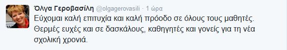 Τις ευχές της στους μαθητές, τους εκπαιδευτικούς και τους γονείς, για τη νέα σχολική χρονιά, εκφράζει η κυβερνητική εκπρόσωπος Όλγα Γεροβασίλη, μέσω Twitter.