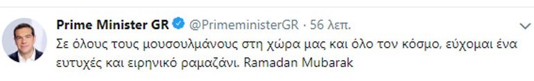 Στην ανάρτησή του ο κ. Τσίπας αναφέρει: «Σε όλους τους μουσουλμάνους στη χώρα μας και όλο τον κόσμο, εύχομαι ένα ευτυχές και ειρηνικό ραμαζάνι. Ramadan Mubarak».