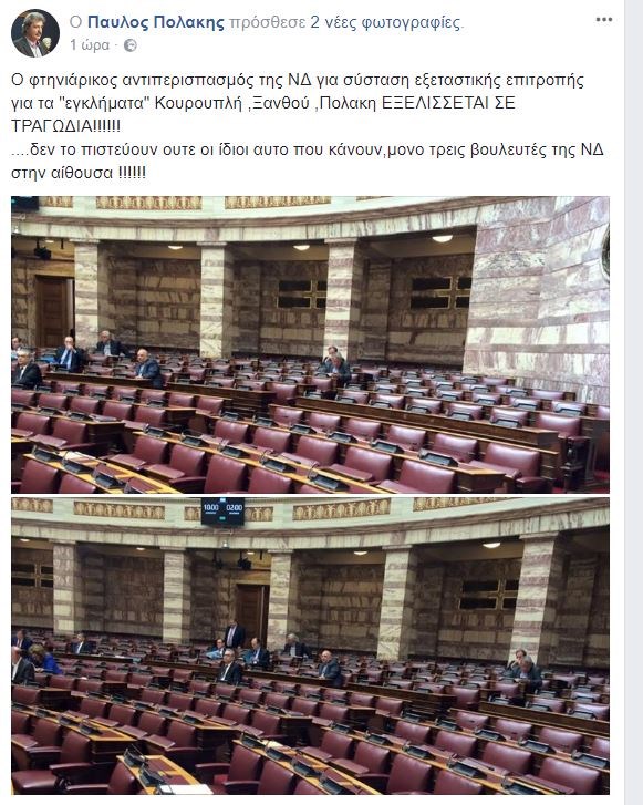 Νέα επίθεση στη ΝΔ εξαπέλυσε ο Παύλος Πολάκης, με αφορμή τη σημερινή συνεδρίαση της Βουλής, όπου συζητείται η πρόταση της αξιωματικής αντιπολίτευσης για σύσταση προανακριτικής επιτροπής για τον ίδιο, τον Ανδρέα Ξανθό και τον Παναγιώτη Κουρουμπλή. «Ο φτηνιάρικος αντιπερισπασμός της ΝΔ για σύσταση εξεταστικής επιτροπής για τα “εγκλήματα” Κουρουμπλή,Ξανθού, Πολάκη εξελίσσεται σε τραγωδία! …δεν το πιστεύουν ούτε οι ίδιοι αυτό που κάνουν, μόνο τρεις βουλευτές της ΝΔ στην αίθουσα!» έγραψε ο αναπληρωτής υπουργός Υγείας.