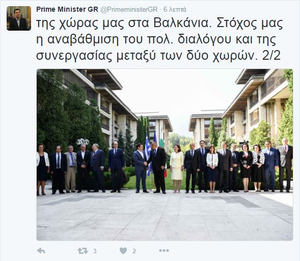 «Στη Σόφια για το Ανώτατο Συμβούλιο Συνεργασίας Ελλάδας-Βουλγαρίας. Η Βουλγαρία είναι ο πλέον στενός εταίρος της χώρας μας στα Βαλκάνια. Στόχος μας η αναβάθμιση του πολ. διαλόγου και της συνεργασίας μεταξύ των δύο χωρών», έγραψε στο Twitter ο Αλέξης Τσίπρας.