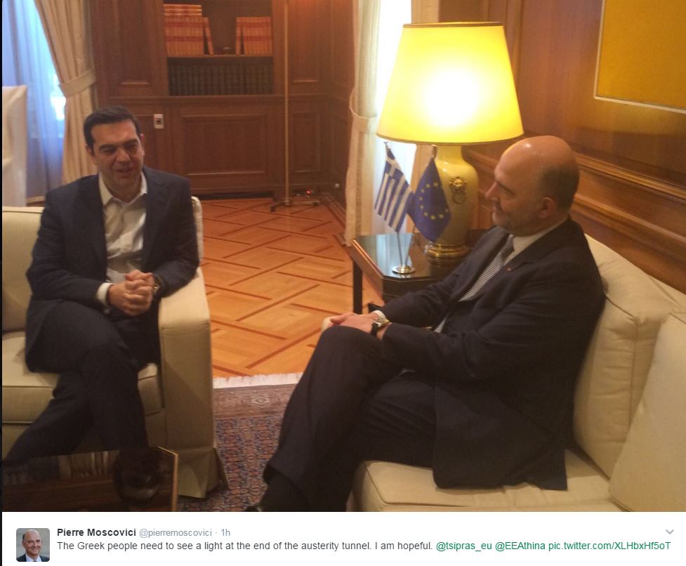 Στη δεύτερη φωτογραφία από το Μέγαρο Μαξίμου, κατά τη συνάντησή του με τον Έλληνα Πρωθυπουργό, Αλέξη Τσίπρα, ο Ευρωπαίος Επίτροπος αναφέρει: «Ο ελληνικός λαός έχει ανάγκη να δει φως στο τέλος του τούνελ της λιτότητας. Είμαι αισιόδοξος».