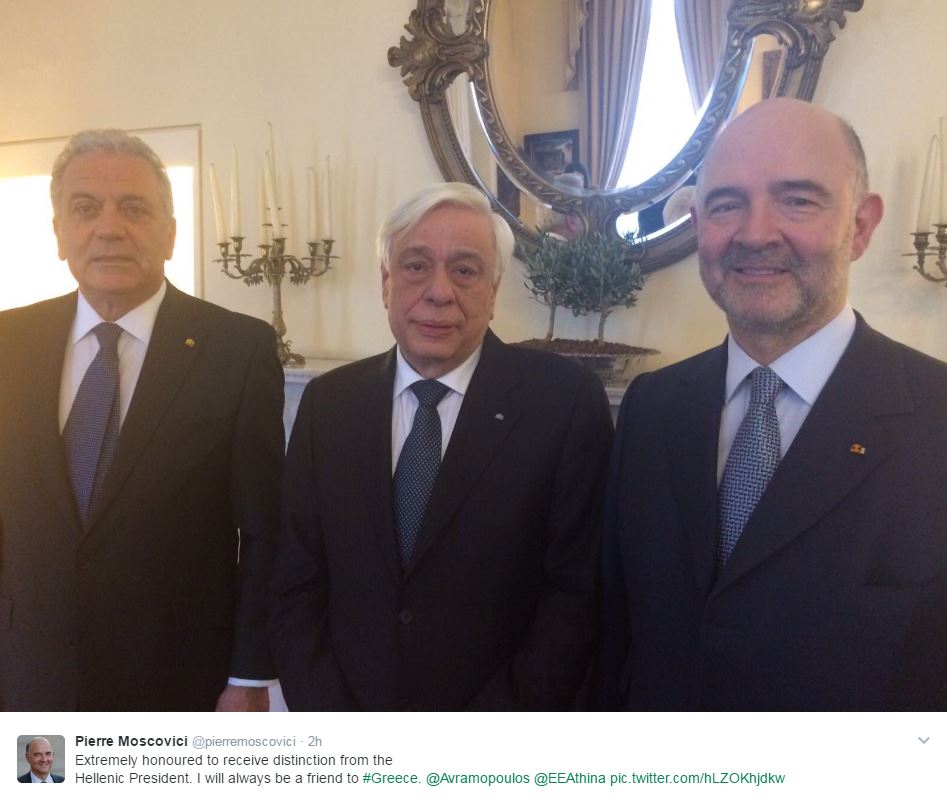 Στο πρώτο tweet, ο κ. Μοσκοβισί ανέβασε μία φωτογραφία μαζί με τον Πρόεδρο της Δημοκρατίας, Προκόπη Παυλόπουλο, και τον Επίτροπο Εσωτερικών Υποθέσεων, Μετανάστευσης και Ιθαγένειας, Δημήτρη Αβραμόπουλο, γράφοντας: Ιδιαίτερα τιμημένος που λαμβάνω τη διάκριση από τον Έλληνα Πρόεδρο της Δημοκρατίας. Θα είμαι πάντα ένας φίλος της Ελλάδας».