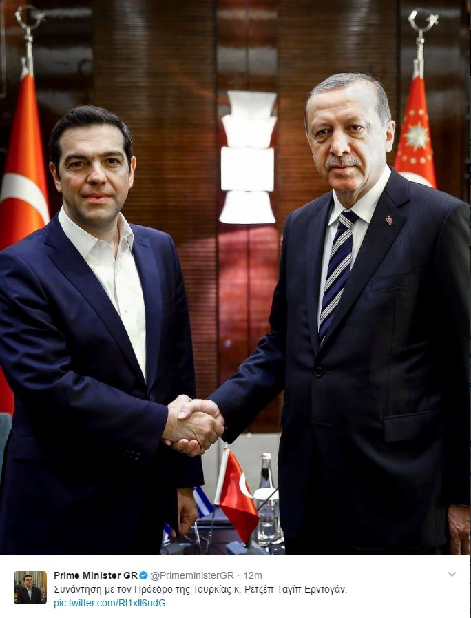 Ο Έλληνας Πρωθυπουργός ανήρτησε στον λογαριασμό στο Twitter μία φωτογραφία από τη χειραψία που είχε με τον Ταγίπ Ερντογάν.
