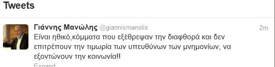 «Είναι ηθικό, κόμματα που εξέθρεψαν την διαφθορά και δεν επιτρέπουν την τιμωρία των υπευθύνων των μνημονίων, να εξοντώνουν την κοινωνία!!»,διερωτάται μέσω Twitter o Γιάννης Μανώλης.Δείτε το σχόλιο που έκανε πριν από λίγα λεπτά το στέλεχος των Ανεξάρτητων Ελλήνων.