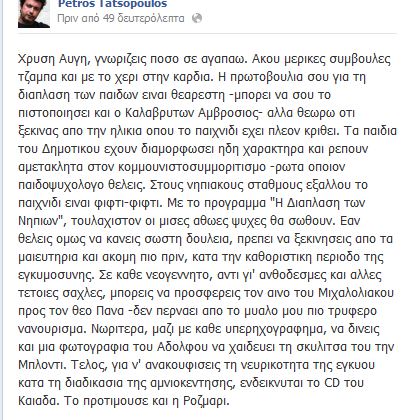 Με σχόλιο που ανήρτησε πριν από λίγο στην προσωπική του σελίδα στο Facebook, o βουλευτής του ΣΥΡΙΖΑ Πέτρος Τατσόπουλος δίνει συμβουλές στην Χρυσή Αυγή.
