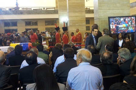 Ο Αλέξης Τσίπρας έγινε δεκτός από τον υφυπουργό Εξωτερικών της Βενεζουέλας, Τεμίρ Πόρρας. Στην είσοδο της στρατωτικής ακαδημίας του Καράκας βρισκόταν και ο προσωρινός πρόεδρος της Βενεζουέλας και «δεξί χέρι» του Τσάβες. Ο Νικολάς Μαντούρο οδήγησε τον πρόεδρο του ΣΥΡΙΖΑ στην πρώτη σειρά των ηγετών και μπροστά στην σορό του «Κομαντάντε» Τσάβες προκειμένου ο Αλέξης Τσίπρας να τον αποχαιρετήσει.