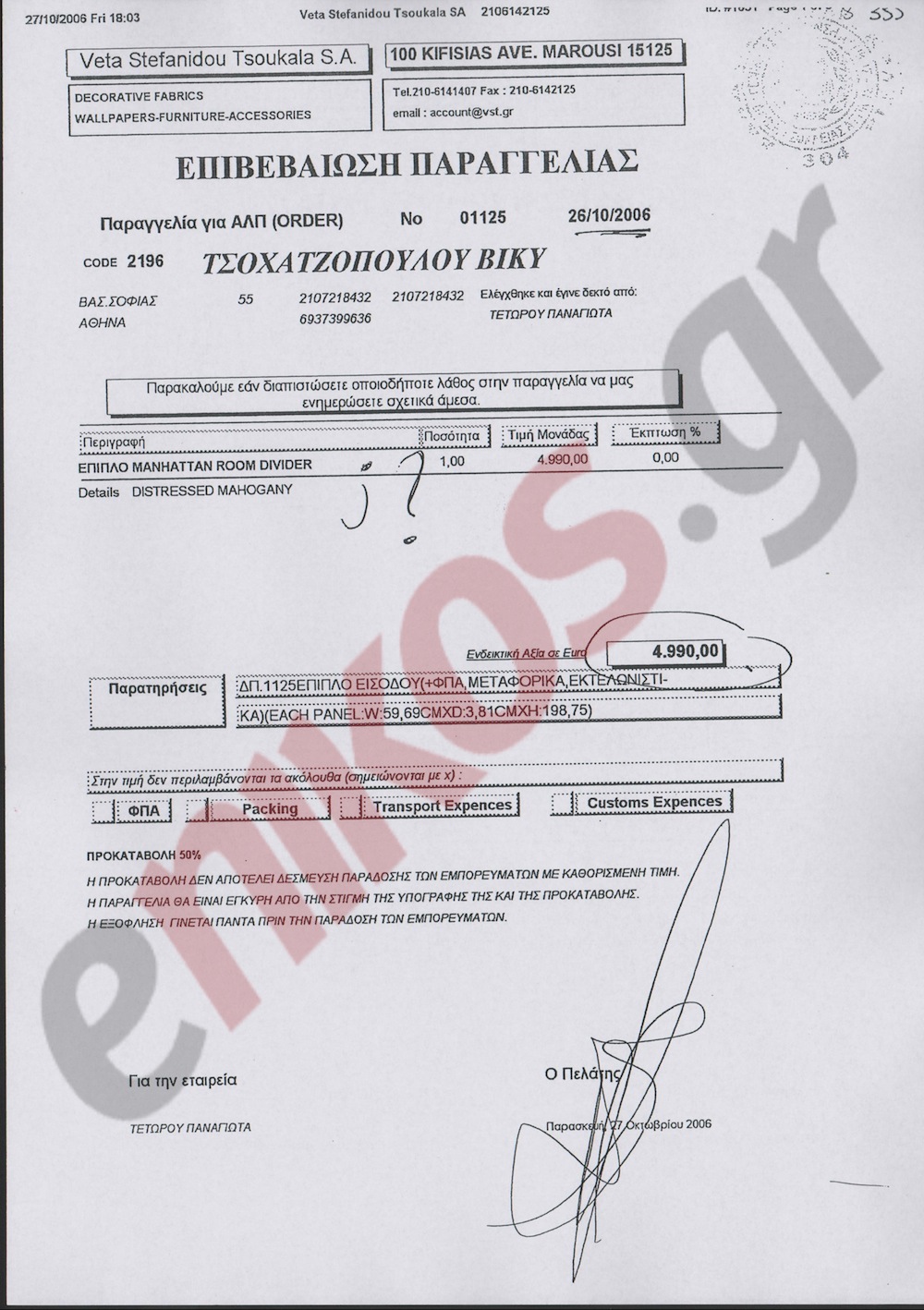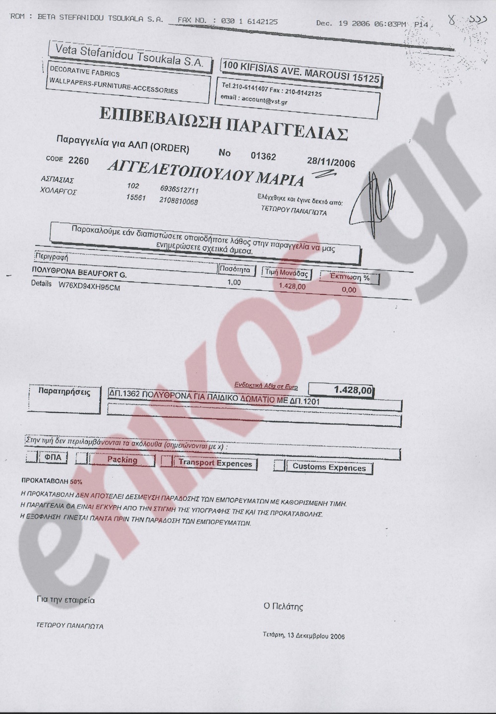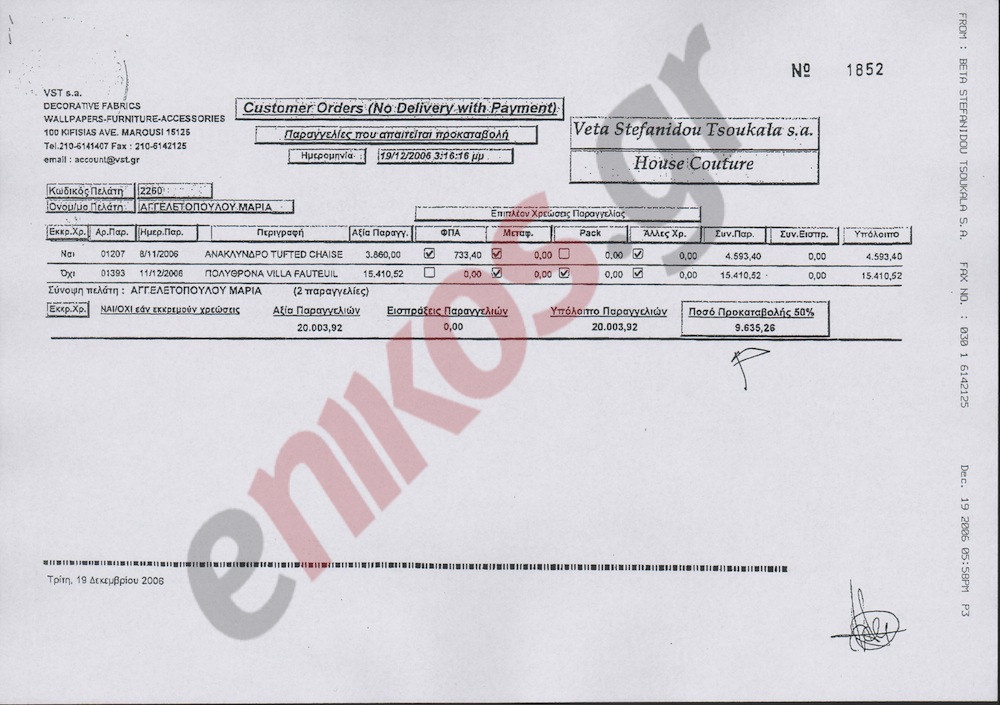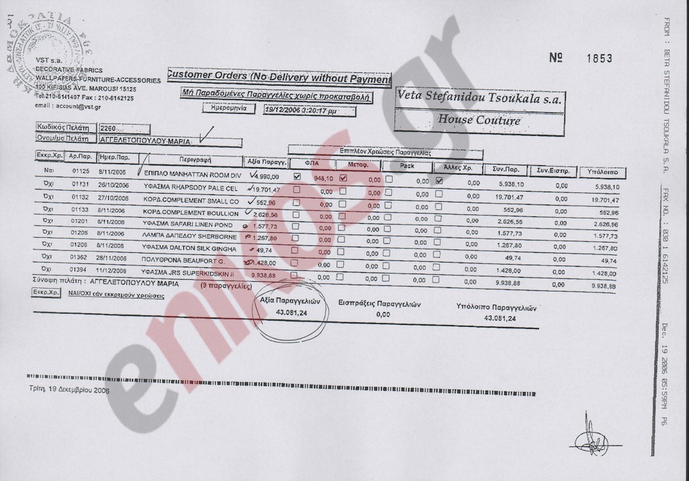 Σε ένα έγγραφο μάλιστα, στο οποίο η εταιρεία επίπλων πληροφορεί τη Βίκυ Σταμάτη και την Μαρία Αγγελετοπούλου για την εξέλιξη των παραγγελιών, φαίνεται ότι το συνολικό ποσό προς εξόφληση είναι 147.887 ευρώ! Κι όλα αυτά μόνο από ένα κατάστημα.