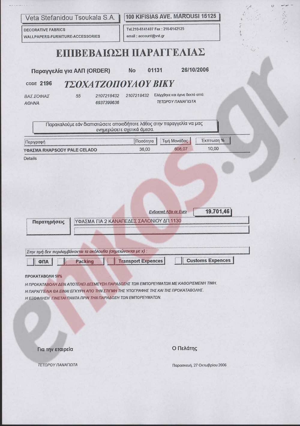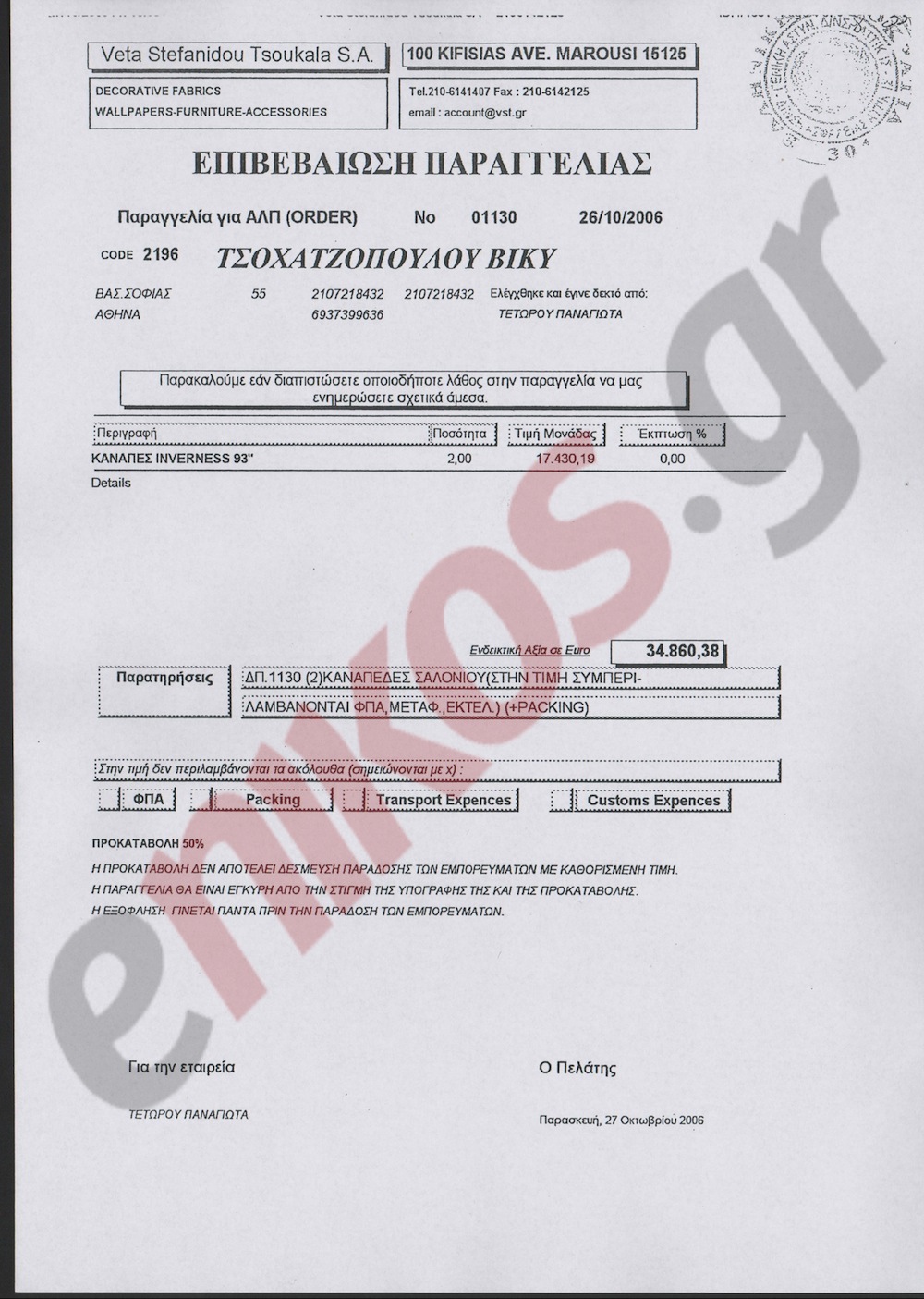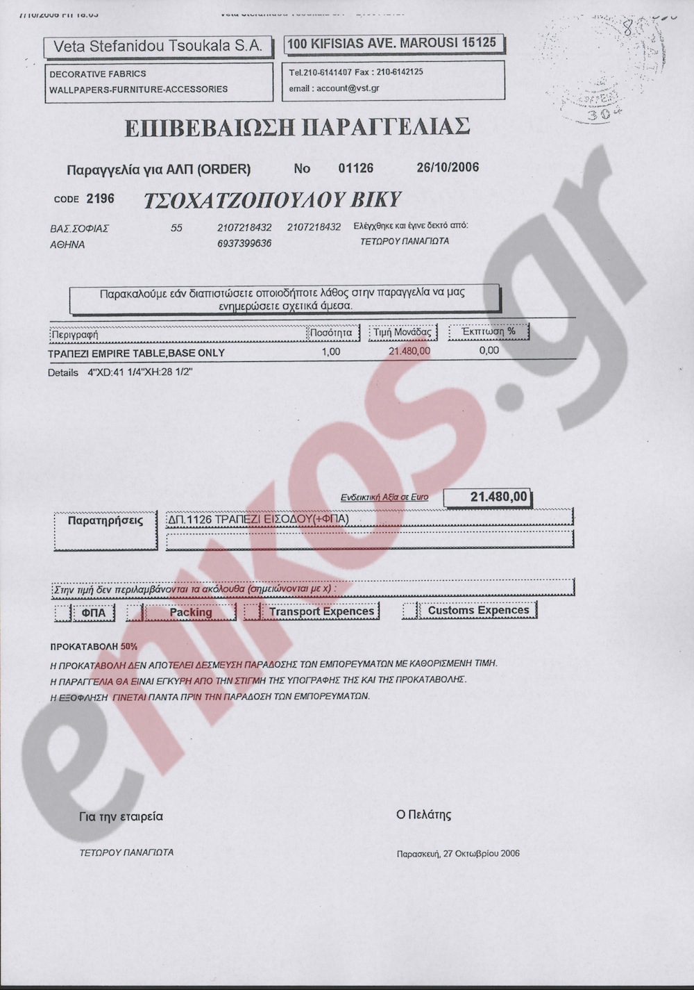 Τιμολόγια χιλιάδων ευρώ περιέχει το προσωπικό αρχείο του Άκη Τσοχατζόπουλου. Ενδεικτική είναι η αγορά δύο καναπέδων αξίας 34.860 ευρώ, δύο πολυθρόνων 15.410 ευρώ, από το γνωστό κατάστημα επίπλων της Βέτας Στεφανίδου-Τσουκαλά στο Μαρούσι.Τα τιμολόγια είναι στο όνομα είτε της συζύγου του Άκη Τσοχατζόπουλου Βίκυς Σταμάτη είτε στο όνομα της συνεργάτιδας του πρώην υπουργού Μαρίας Αγγελετοπούλου.