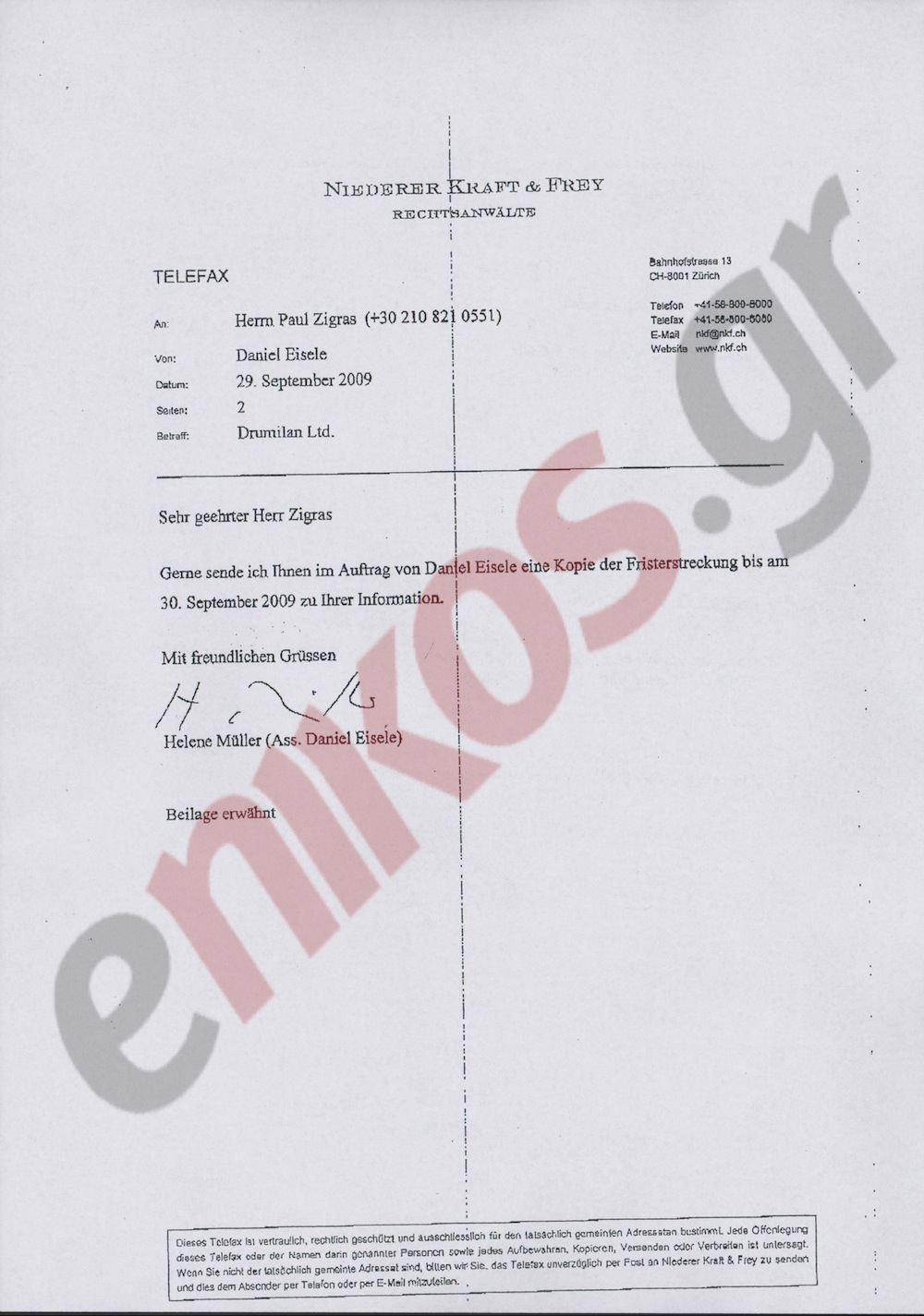 Την ίδια στιγμή, μεταξύ των εγγράφων που κατασχέθηκαν είναι και η αλληλογραφία του πρώτου εξαδέλφου του Άκη Τσοχατζόπουλου, Νίκου Ζήγρα, με την ελβετική δικηγορική εταιρεία NIEDERER KRAFT&FREY, η οποία συνεργάζεται μόνο με απαιτητικούς πελάτες. Θέμα της αλληλογραφίας αναφέρεται η “Drumilan Ltd”, μέσω της οποίας διακινήθηκαν εκατομμύρια ευρώ στην υπόθεση των ΤΟR M1.