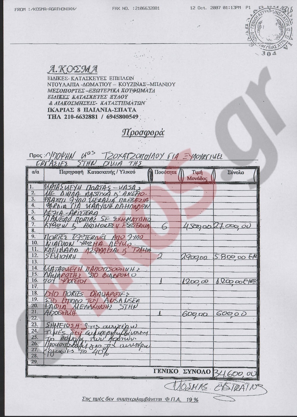 Επίσης, σε ένα τιμολόγιο στο όνομα της Βίκυς Σταμάτη, από το κατάστημα επίπλων Α. Κοσμάς, στην Παιανία, φαίνεται ότι η σύζυγος του Άκη Τσοχατζόπουλου ξόδεψε για έξι πόρτες 27.000 ευρώ, ενώ μία… παπουτσοθήκη κόστισε 1.200 ευρώ!