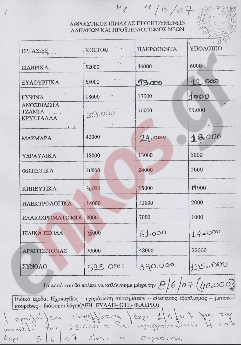 Σύμφωνα με ένα έγγραφο με τίτλο «Αθροιστικός πίνακας προηγουμένων δαπανών και προϋπολογισμός νέων» που αφορά στον Ιούνιο του 2007 φαίνεται ότι σπαταλήθηκαν για μάρμαρα 42.000 ευρώ, για κηπευτικά 34.000 ευρώ και για ανοξείδωτα τζάμια-κρύσταλλα 103.000 ευρώ, ενώ  στον αρχιτέκτονα, δόθηκε το ποσό των 70.000 ευρώ. Το συνολικό κόστος των εργασιών ανέρχεται στο αστρονομικό ποσό των 525.000 ευρώ, ενώ στο χαρτί αναφέρεται μάλιστα χαρακτηριστικά ότι «Το ποσό που θα πρέπει να καλύψουμε μέχρι την 8 Ιουνίου είναι 40.000 ευρώ».