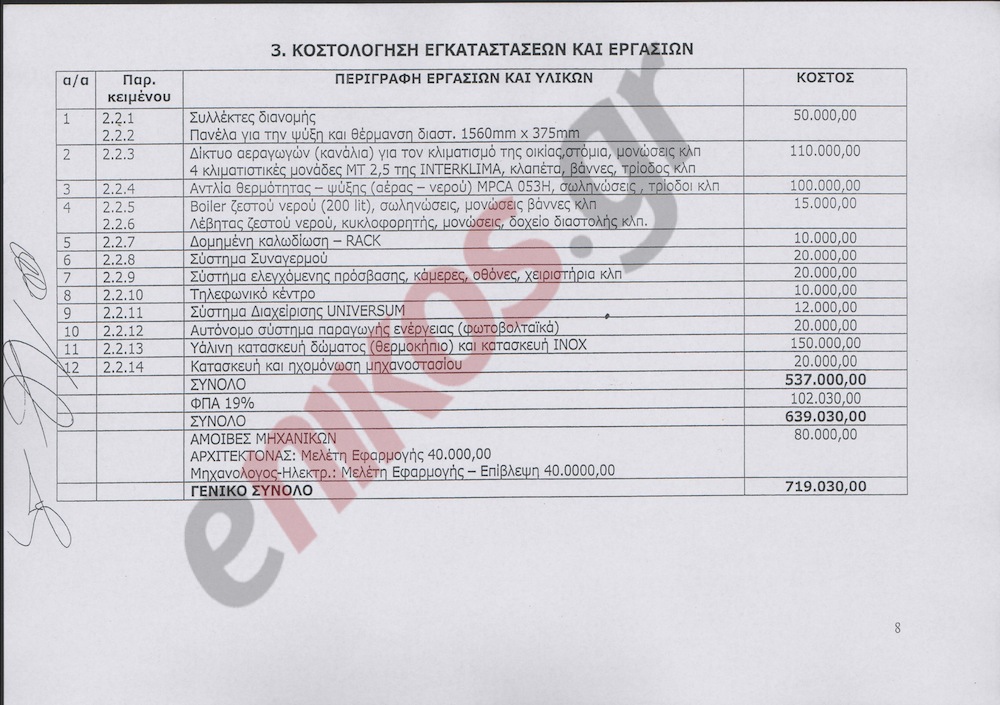 Σε άλλο έγγραφο, στο οποίο περιγράφονται αναλυτικά οι εγκαταστάσεις και οι εργασίες – άγνωστο για ποιο ακίνητο- το συνολικό κόστος ανέρχεται σε 719.030 ευρώ! Ενδεικτικά αναφέρεται ότι έχει προβλεφθεί ακόμη και θερμοκήπιο στην ταράτσα αξίας 150.000 ευρώ, αυτόνομο σύστημα παραγωγής φωτοβολταικών 20.000 ευρώ, σύστημα κλιματισμού αξίας 110.000 ευρώ αλλά και τηλεφωνικό κέντρο 10.000 ευρώ!