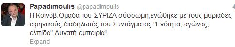 O βουλευτής Δημήτρης Παπαδημούλης, με ένα tweet ανακοινώνει ότι οι βουλευτές του ΣΥΡΙΖΑ βγήκαν στο δρόμο.