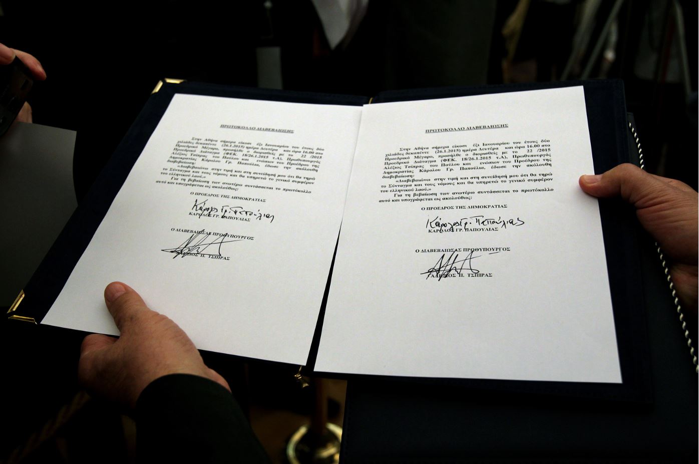 Δείτε στη φωτογραφία τις υπογραφές του προέδρου του ΣΥΡΙΖΑ και του Προέδρου της Δημοκρατίας στο πρωτόκολλο ορκωμοσίας μετά την πολιτική του ορκωμοσία στο Προεδρικό Μέγαρο.
