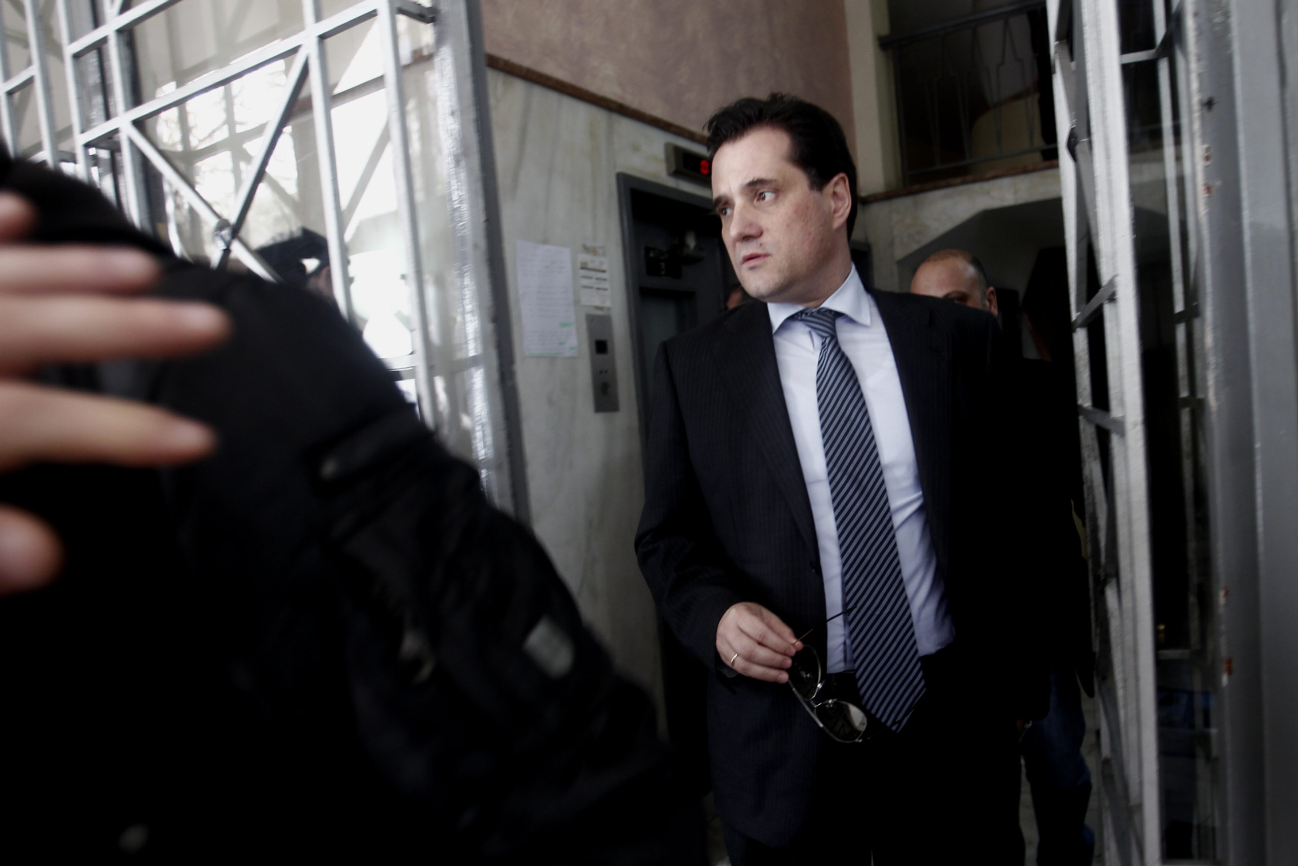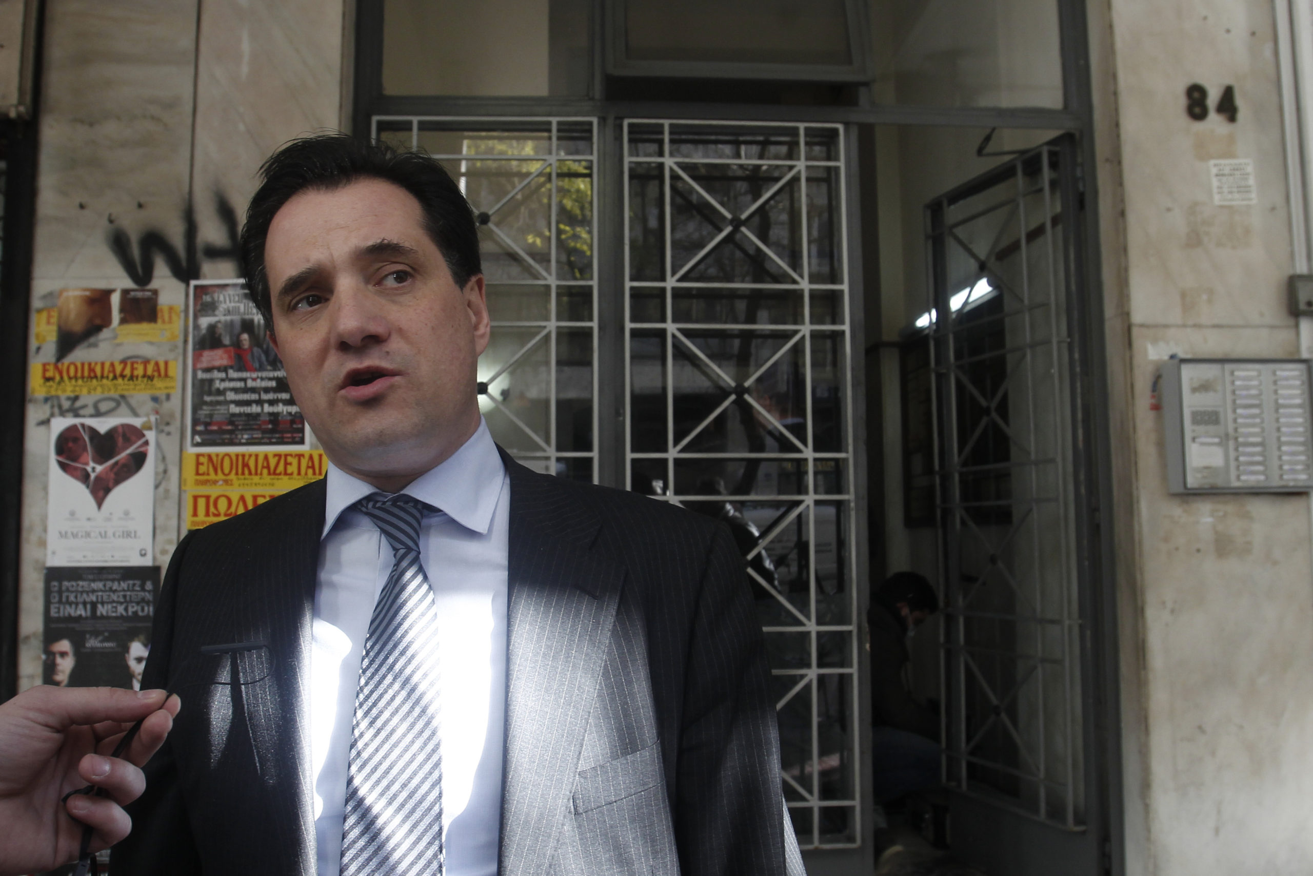 Ο Άδωνις Γεωργιάδης εξέρχεται από το πολιτικό του γραφείο.