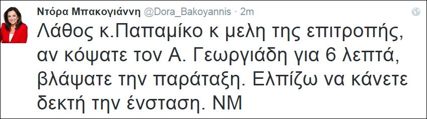 «Λάθος κ.Παπαμιμίκο και μέλη της επιτροπής, αν κόψατε τον Α. Γεωργιάδη για 6 λεπτά, βλάψατε την παράταξη. Ελπίζω να κάνετε δεκτή την ένσταση», έγραψε η Ντόρα Μπακογιάννη.