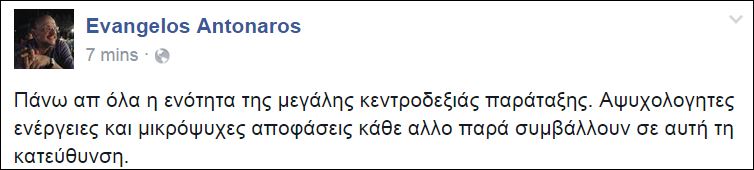 «Πάνω απ’ όλα η ενότητα της μεγάλης κεντροδεξιάς παράταξης. Αψυχολόγητες ενέργειες και μικρόψυχες αποφάσεις κάθε άλλο παρά συμβάλλουν σε αυτή τη κατεύθυνση», έγραψε στον προσωπικό του λογαριασμό στο facebook ο κ. Αντώναρος.
