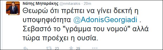 Ο Νότης Μηταράκης θεωρεί ότι πρέπει να γίνει δεκτή η υποψηφιότητα του Άδωνι Γεωργιάδη, όπως έγραψε στο Twitter.«Θεωρώ ότι πρέπει να γίνει δεκτή η υποψηφιότητα του Άδωνι Γεωργιάδη. Σεβαστό το “γράμμα του νομού”, αλλά τώρα προέχει η ουσία», ήταν το σχόλιο του βουλευτή της Νέας Δημοκρατίας.