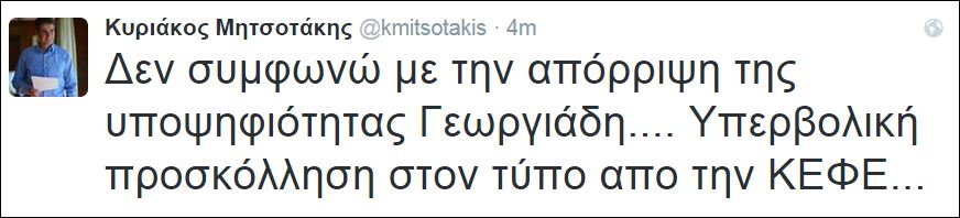 «Δεν συμφωνώ με την απόρριψη της υποψηφιότητας Γεωργιάδη…. Υπερβολική προσκόλληση στον τύπο από την ΚΕΦΕ…».