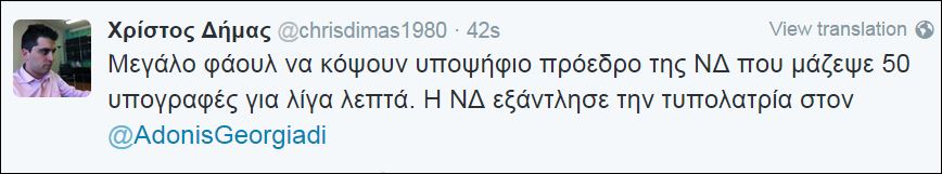 Τη διαφωνία του με την απόφαση της εφορευτικής επιτροπής της ΝΔ να απορρίψει την υποψηφιότητα του Άδωνι Γεωργιάδη για την προεδρία του κόμματος εξέφρασε μέσω twitter και ο Κυριάκος Μητσοτάκης.