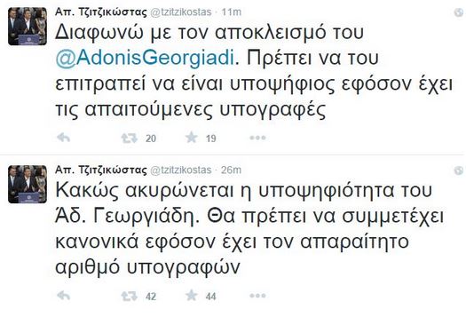 Διαφωνώ με τον αποκλεισμό του Άδωνι Γεωργιάδη. Πρέπει να του επιτραπεί να είναι υποψήφιος εφόσον έχει τις απαιτούμενες υπογραφές” έγραψε στο Τwitter.