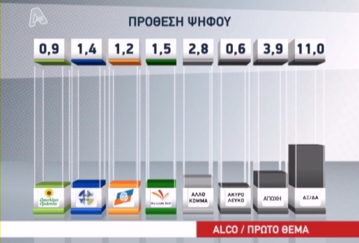 Την πρώτη θέση στην πρόθεση ψήφου παίρνει το κόμμα της ΝΔ και στη δημοσκόπηση της ALCO για το «Πρώτο Θέμα», καθώς συγκεντρώνει ποσοστό 22,1%. Στη δεύτερη θέση ο ΣΥΡΙΖΑ με 20,4% και το ΠΑΣΟΚ στην τρίτη με 12,9%. Ακολουθούν οι Ανεξάρτητοι Έλληνες με 7,0%, ΔΗΜΑΡ 5,7%, ΚΚΕ 5,0%, Χρυσή Αυγή 3,0%, Δημιουργία Ξανά 1,5%, ΛΑΟΣ 1,4%, Δημοκρατική Συμμαχία 1,2% και Οικολόγοι Πράσινοι 0,9%. Άλλο κόμμα απάντησε το 2,8% των ερωτηθέντων, η αποχή συγκεντρώνει 3,9%, 0,6% το άκυρο ή λευκό, ενώ το ποσοστό των αναποφάσιστων στη δημοσκόπηση συγκεντρώνει ποσοστό 11%.