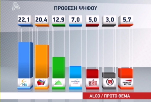 Την πρώτη θέση στην πρόθεση ψήφου παίρνει το κόμμα της ΝΔ και στη δημοσκόπηση της ALCO για το «Πρώτο Θέμα», καθώς συγκεντρώνει ποσοστό 22,1%. Στη δεύτερη θέση ο ΣΥΡΙΖΑ με 20,4% και το ΠΑΣΟΚ στην τρίτη με 12,9%. Ακολουθούν οι Ανεξάρτητοι Έλληνες με 7,0%, ΔΗΜΑΡ 5,7%, ΚΚΕ 5,0%, Χρυσή Αυγή 3,0%, Δημιουργία Ξανά 1,5%, ΛΑΟΣ 1,4%, Δημοκρατική Συμμαχία 1,2% και Οικολόγοι Πράσινοι 0,9%. Άλλο κόμμα απάντησε το 2,8% των ερωτηθέντων, η αποχή συγκεντρώνει 3,9%, 0,6% το άκυρο ή λευκό, ενώ το ποσοστό των αναποφάσιστων στη δημοσκόπηση συγκεντρώνει ποσοστό 11%.