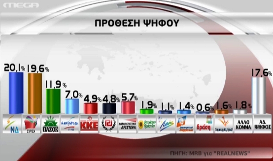 Στη δημοσκόπηση της MRB για την Realnews, η ΝΔ συγκεντρώνει το υψηλότερο ποσοστό στην πρόθεση ψήφου με 20,1% και ακολουθεί ο ΣΥΡΙΖΑ με 19,6%. Στην τρίτη θέση βρίσκεται με ποσοστό 11,9% το ΠΑΣΟΚ και ακολουθούν: Ανεξάρτητοι Έλληνες 7,0%, ΔΗΜΑΡ 5,7%, ΚΚΕ 4,9%, Χρυσή Αυγή 4,8%, Οικολόγοι Πράσινοι 1,9%, Δημιουργία Ξανά 1,6%, Δημοκρατική Συμμαχία 1,4%, ΛΑΟΣ 1,1%. Άλλο κόμμα απάντησε ποσοστό 1,1% των ερωτηθέντων, ενώ στο 17,6% εκτιμάται η αδιευκρίνιστη ψήφος.
