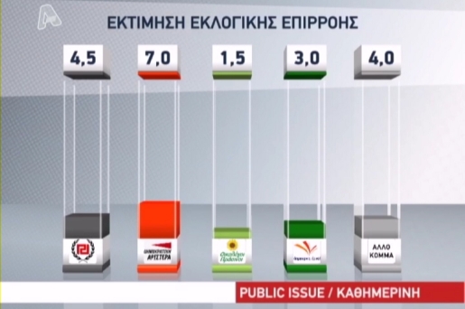 Στη δημοσκόπηση της PUBLIC ISSUE για την «Καθημερινή», στην οποία εξετάζεται η εκτίμηση εκλογικής επιρροής, ο ΣΥΡΙΖΑ συγκεντρώνει 28%, η ΝΔ 24% και το ΠΑΣΟΚ 15%, ενώ ακολουθούν: Ανεξάρτητοι Έλληνες 8%, ΔΗΜΑΡ 7%, ΚΚΕ 5%, Χρυσή Αυγή 4,5%, Δημιουργία Ξανά 3%, Οικολόγοι Πράσινοι 1,5%, Άλλο Κόμμα 4%.