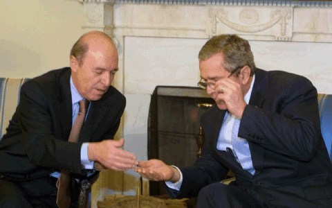 Τον Ιανουάριο του 2002, ο Κώστας Σημίτης μεταβαίνει ξανά στις ΗΠΑ και είναι ο πρώτος Ευρωπαίος ηγέτης που μεταφέρει το νόμισμα της ευρωζώνης – το ευρώ – στον Λευκό Οίκο. Συν τοις άλλοις, χαρίζει στον Τζορτζ Μπους τον νεότερο το μπλουζάκι των Ολυμπιακών αγώνων της Αθήνας, το οποίο βγάζει από μια τσάντα των duty free που κρατούσε μπαίνοντας στο γραφείο του προέδρου.