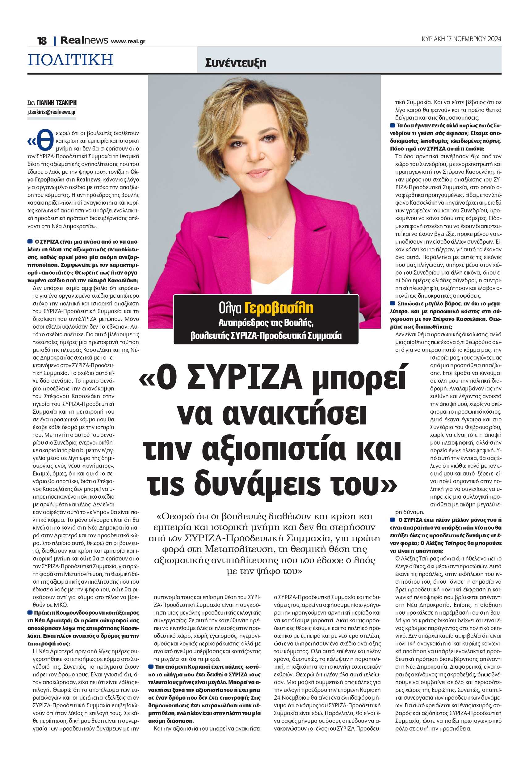 Και την αξιοπιστία του μπορεί να ανακτήσει ο ΣΥΡΙΖΑ-Προοδευτική Συμμαχία και τις δυνάμεις του, αρκεί να αφήσουμε πίσω γρήγορα την προηγούμενη αρνητική περίοδο και να κοιτάξουμε μπροστά. Διότι και τις προοδευτικές θέσεις έχουμε και το πολιτικό προσωπικό με έμπειρα και με νεότερα στελέχη, ώστε να υπηρετήσουν ένα σχέδιο ανάταξης του κόμματος. Ολα αυτά επί έναν και πλέον χρόνο, δυστυχώς, τα κάλυψαν η παραπολιτική, η τοξικότητα και το κυνήγι εσωτερικών εχθρών. Θεωρώ ότι πλέον όλα αυτά τελείωσαν. Μια μαζική συμμετοχή στις κάλπες για την εκλογή προέδρου την επόμενη Κυριακή 24 Νοεμβρίου θα είναι ένα ελπιδοφόρο μήνυμα ότι ο κόσμος του ΣΥΡΙΖΑ-Προοδευτική Συμμαχία είναι εδώ. Παράλληλα, θα είναι ένα σαφές μήνυμα σε όσους σπεύδουν να ανακοινώσουν το τέλος του ΣΥΡΙΖΑ-Προοδευτική Συμμαχία. Και να είστε βέβαιος ότι σε λίγο καιρό θα φανούν και τα πρώτα θετικά δείγματα και στις δημοσκοπήσεις.