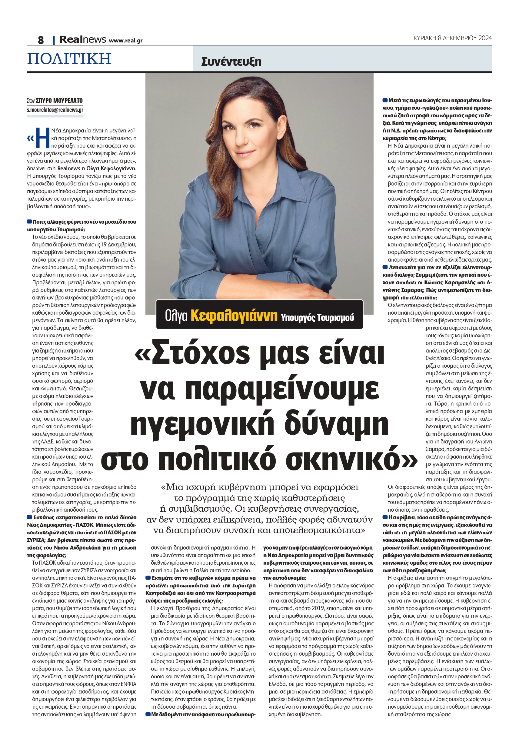 «Η Νέα Δημοκρατία είναι η μεγάλη λαϊκή παράταξη της Μεταπολίτευσης, η παράταξη που έχει καταφέρει να εκφράζει μεγάλες κοινωνικές πλειοψηφίες. Αυτό είναι ένα από τα μεγαλύτερα πλεονεκτήματά μας», δηλώνει στη Realnews η Όλγα Κεφαλογιάννη.