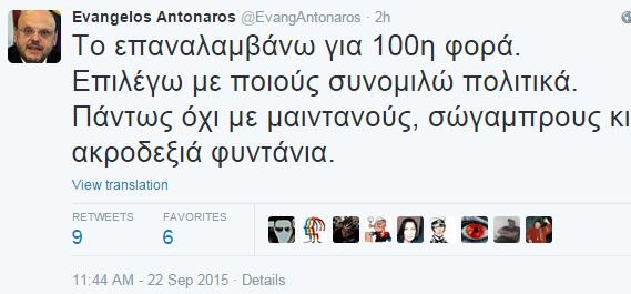 “Το επαναλαμβάνω για 100η φορά. Επιλέγω με ποιους συνομιλώ πολιτικά. Πάντως όχι με μαιντανούς, σώγαμπρους κι ακροδεξιά φυντάνια”, απάντησε ο κ. Αντώναρος, φωτογραφίζοντας εκ νέου τον κ. Γεωργιάδη.