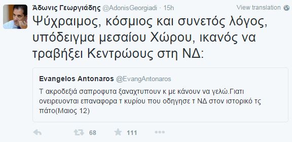 “Ψύχραιμος, κόσμιος και συνετός λόγος, υπόδειγμα μεσαίου χώρου, ικανός να τραβήξει κεντρώους στη ΝΔ”, έγραψε λίγο αργότερα ο κ. Γεωργιάδης επισυνάπτοντας το tweet του κ. Αντώναρου.