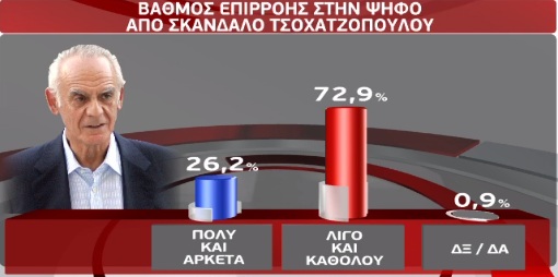 Τα ποσοστά μάλιστα όπως βλέπετε είναι συντριπτικά ανάμεσα στους ψηφοφόρους όλων των κομμάτων. Την ίδια στιγμή από το 84,4% των ερωτώμενων που απάντησαν ότι η εξεταστική επιτροπή του 2005 δεν καταλόγισε ευθύνες στον πρώην υπουργό επειδή “σίγουρα ή μάλλον ήθελε να κουκουλώσει το σκάνδαλο”, το 86,2% ρίχνει την ευθύνη από κοινού στους βουλευτές του ΠΑΣΟΚ και της ΝΔ. Το 11,1% θεωρεί ότι σκάνδαλο ήθελαν να κουκουλώσουν οι βουλευτές του ΠΑΣΟΚ.   Τέλος, 1 στους 4 ψηφοφόρους (26,9%) δηλώνει ότι θα επηρεαστεί “πολύ και αρκετά” από το σκάνδαλο Τσοχατζόπουλου, ενώ το 72,9% απαντά “λίγο και καθόλου”.