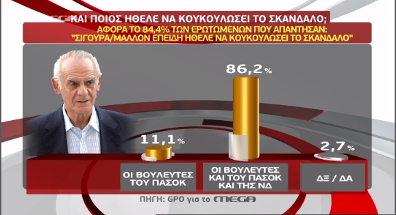 Για προσπάθεια “κουκούλωματος” του σκανδάλου από την εξεταστική επιτροπή του 2005, που δεν είχε καταλογίσει ευθύνες στον Άκη Τσοχατζόπουλο, κάνει λόγο το 84,4% των ερωτώμενων σύμφωνα με τη δημοσκόπηση της GPO για το MEGA. Είναι χαρακτηριστικό ότι μόλις το 11,4% απαντά ότι δεν καταλογίστηκαν ευθύνες επειδή δεν είχαν προκύψει στοιχεία.