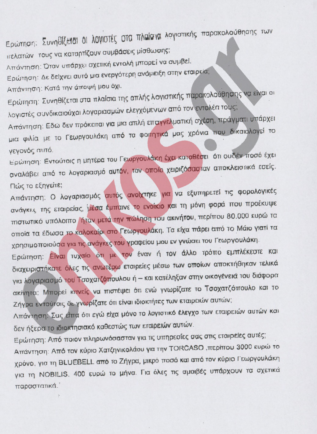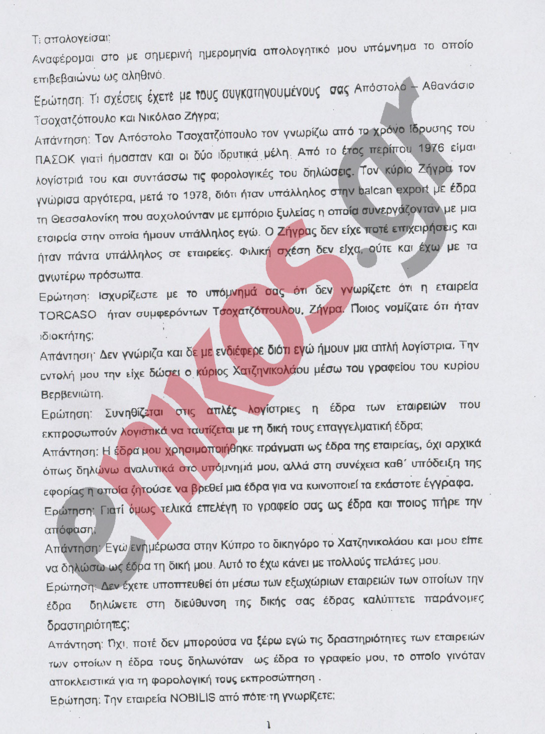 Διαβάστε ολόκληρη την απολογία ενώπιον του ανακριτή της λογίστριας του Άκη Τσοχατζόπουλου, Ευφροσύνης Λαμπροπούλου, η οποία πλέον βρίσκεται στις φυλακές Κορυδαλλού. Η σχέση της Ευφροσύνης Λαμπροπούλου, (η οποία εμφανίζεται και στις τρεις off shore: Torcaso, Nobilis, Blue Bell που εμπλέκονται στις αγοραπωλησίες των ακινήτων της οικογένειας του Άκη Τσοχατζόπουλου) με τον πρώην υπουργό ξεκινά τη δεκαετία του ’80, όταν η ίδια εργαζόταν ως λογίστρια στα γραφεία του ΠΑ.ΣΟ.Κ.