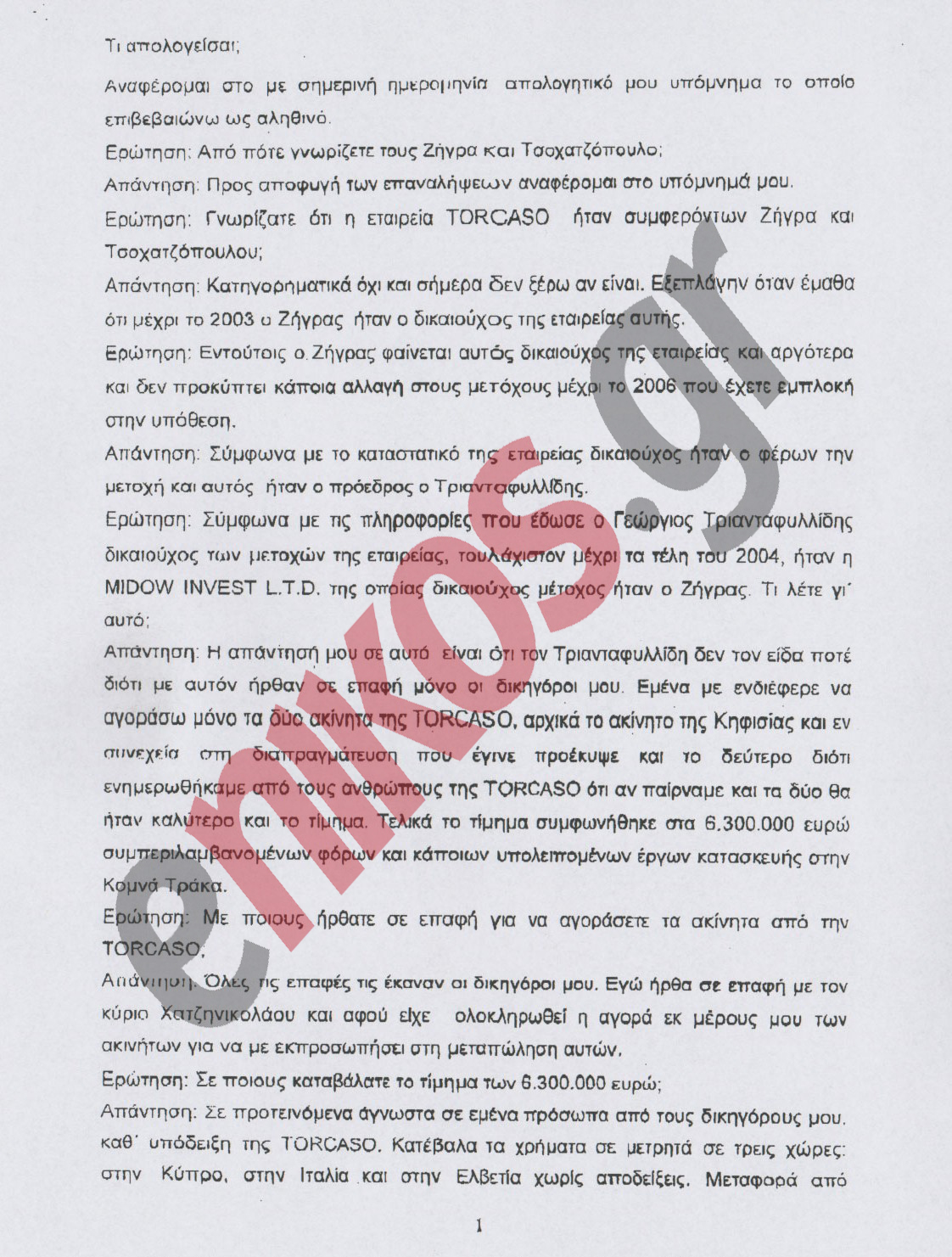 Διαβάστε ολόκληρη την απολογία ενώπιον του ανακριτή του κουμπάρου του Άκη Τσοχατζόπουλου, επιχειρηματία, Γιώργου Σαχπατζίδη, ο οποίος πλέον βρίσκεται στις φυλακές Κορυδαλλού.Ο Γιώργος Σαχπατζίδης, ο οποίος μεταξύ άλλων είναι και μέτοχος του ΠΑΟΚ, εμπλέκεται στην off shore εταιρεία Τοrcaso από την οποία μεταβιβάστηκαν ακίνητα στην Μονή Βατοπαιδίου, ενώ η ίδια εταιρεία εμφανίζεται και στην αγοραπωλησία του νεοκλασικού της Δ. Αρεοπαγίτου.