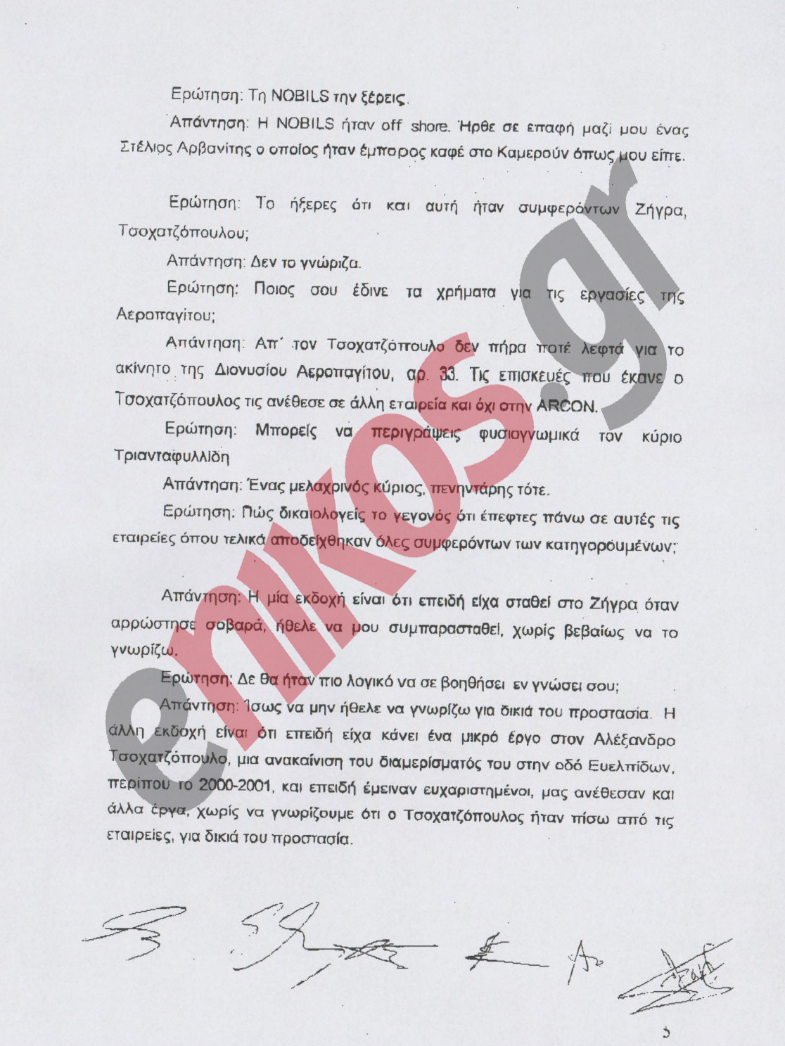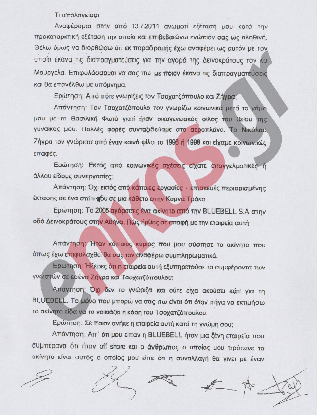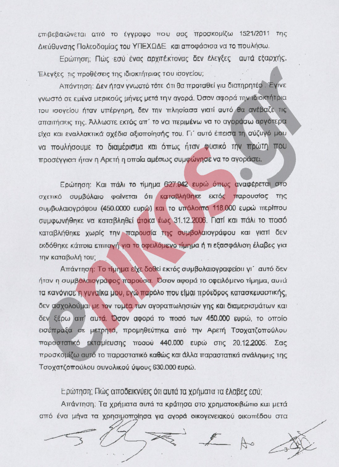 Διαβάστε ολόκληρη την απολογία ενώπιον του ανακριτή του Αστέριου Οικονομίδη, διευθύνοντα συμβούλου και μεγαλομέτοχου της Arcon Constructions, ο οποίος βρίσκεται πλέον στις φυλακές Κορυδαλλού.H Arcon Constructions είχε αναλάβει την ανακαίνιση του νεοκλασικού της Δ. Αρεοπαγίτου, καθώς και του ακινήτου της οδού της Κόμνα Τράκα και Κεφαλληνίας που αγόρασε η off shore Τorcaso (δικαιούχος της οποίας είναι ο εξάδελφος του Άκη Τσοχατζόπουλου) και στη συνέχεια μεταβίβασε στη Μονή Βατοπαιδίου.Επίσης, ο Αστέριος Οικονομίδης αγόρασε την οικία της Αρετής Τσοχατζοπούλου από την off shore Bluebell (δικαιούχος της οποίας είναι επίσης ο εξάδελφος του Άκη Τσοχατζόπουλου) και στη συνέχεια πούλησε στην κόρη του πρώην υπουργού.