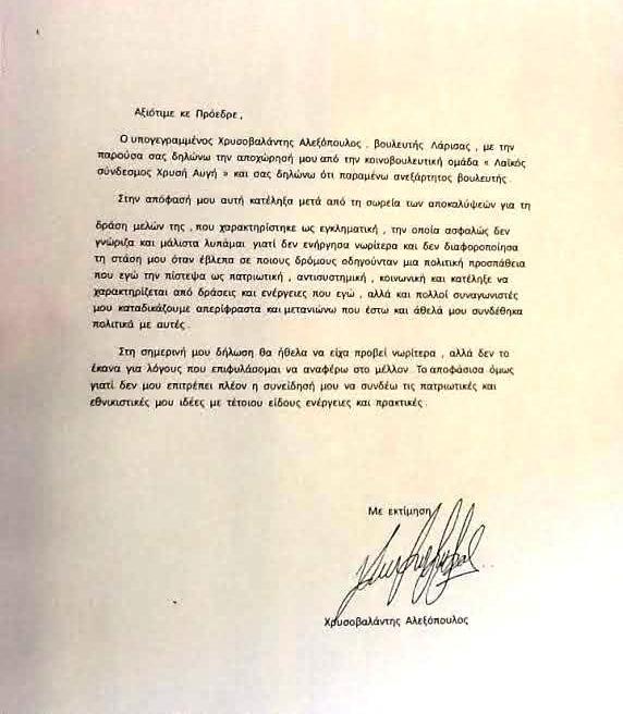 Ο υπογεγραμμένος Χρυσοβαλάντης Αλεξόπουλος, βουλευτής Λάρισας, με την παρούσα σας δηλώνω την αποχώρηση μου από την κοινοβουλευτική ομάδα «Λαϊκός σύνδεσμος Χρυσή Αυγή» και σας δηλώνω ότι παραμένω ανεξάρτητος βουλευτής.