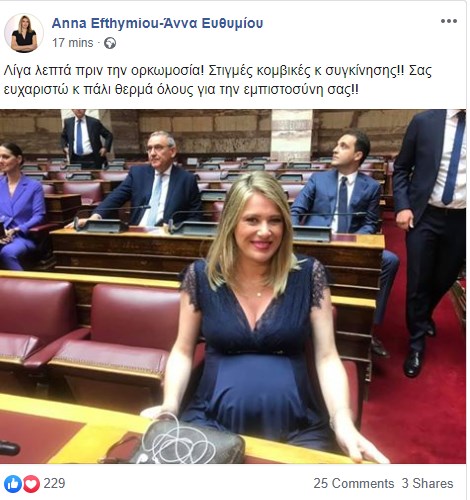 “Λίγα λεπτά πριν από την ορκωμοσία! Στιγμές κομβικές και συγκίνησης!! Σας ευχαριστώ και πάλι θερμά όλους για την εμπιστοσύνη σας” έγραψε η βουλευτής της ΝΔ, Άννα Ευθυμίου και ανέβασε μία φωτογραφία της στον λογαριασμό της στο facebook.